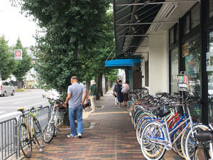 You will find bus stop. turn right along by the bicycle shop.